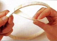 Для того, чтобы состоящие из двух обручей пяльцы, возьмите мягкую тесьму и обмотайте один из обручей по окружности. Натягивайте тесьму так, чтобы не образовались складки